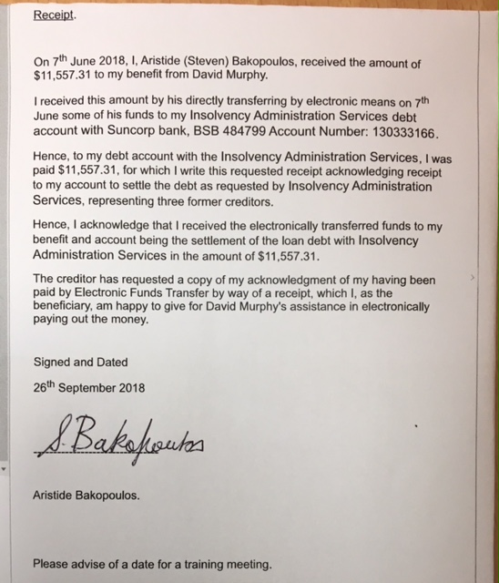 In 2017 the common law equitable entitlement moneys known as ‘Reserve One’ were getting alarmingly large and I knew I had to do something with them lest there be an allegation that I had abandoned the moneys. I reasoned that if I had moneys that stemmed from a Terms of Settlement, which I was not the actual party who had breached, and a Supreme Supreme Court Order and a Deed of Engagement and Provision, to which I was not the party to be in default, and a consequent provisional, upside, insuring, guarantee given to me by a subsidiary of a major bank, then one thing I should be able to do with such ‘alternate’ Australian legal tender moneys, unaffected by statute of limitations, bankruptcy, breach or default by me, and never spent, is pay some debts. So, hence, in 2017 I decided to use my moneys to pay off ten old credit card debts that had been frozen since 1997 waiting for me to come back and pay them off. I used the moneys to pay off the ten credit card debts with each of the four big banks and proved that my Court order, Deed modified moneys can be used to pay debts (Westpac, Commonwealth). I then proceeded to use the moneys to pay out debts for other people who are appreciative from my lawfully established, accruing funds. Here are eight testimonials from eight different people whose loans were lawfully paid out by way of my sending money from my Reserve 1 / 12 accounts to their creditor’s bank: